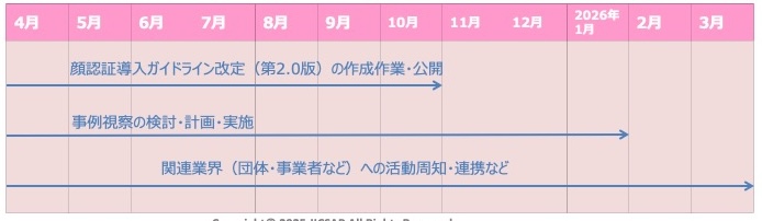 - 交通・流通をはじめ想定される各利用場面を対象に、複数ベンダーシステムの混在や相互利用などを見据え、顔認証の導入要件や基準作りについて研究・検討する